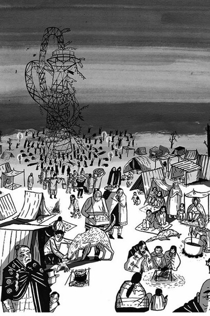 Kunzru’s story is written in a series of short passages that move in a non-linear way through the dystopian world he created. Each of the designers and illustrators worked on a different passage of text from the story, responding freely to the text. The resulting commissions vary dramatically in scale and format, from intricate hand-drawn works to large three-dimensional environments.