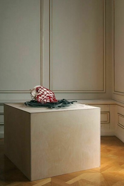 Kostas Sahpazis describes his work as being based in the properties and characteristics of materials both as natural entities and intelligible structures. Gestures, forms, ideas, materials are archived, riven, condensed and finally used to form an object with a constant disposition to undermine its own form. The materials he uses in his sculptural objects and assemblages, some of which are wall-pieces carrying attributes primarily associated with painting, range from jesmonite, resins, latex, wood, oil paint, fabric to leather, water cut steel, aluminum, copper, red clay. His process can be summarized as a continuous shift of an original idea; the meanings of all the stages remain suspended in the resulting object.
