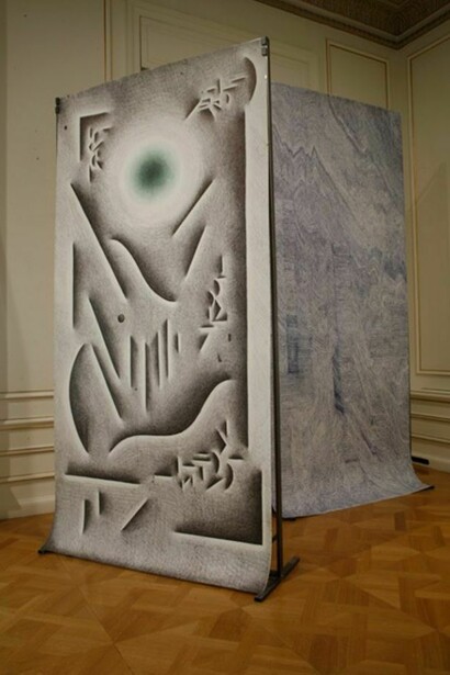 Alexandros Tzannis mainly aims to speak of time by bringing to our attention things soon to be forgotten. His intention is made manifest in the manner of his work – a laborious, time-consuming process – as well as in his choice of lowbrow materials that combine with a futurist aesthetic, linear drawings, cosmic sculptural forms and neon lights to produce a varied visual counterpoint.