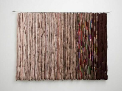 Hicks describes her work as 'unbiased weaves', a phrase which not only reflects her fascination for language and poetry but her interest in classifications. Crucial components of her language include colour with embedded texture, and structure that employs found objects, artifacts and unexpected materials including stainless steel and porcupine quills. Her sculptural works, often of a monumental scale, betray her fascination with fibre and thread, which she employs as a dynamic medium. Hicks holds the firm belief that material be allowed to express its inherent nature - she avoids armatures, preferring to stack and twist cascading linen, bound ropes, sinuous skeins, wrapped bundles and intertwined filaments of silk.