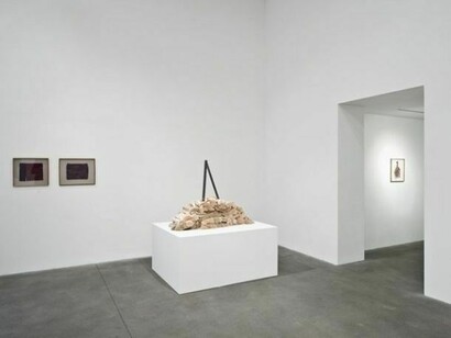 In the main gallery, three large new works exemplify the artist's extraordinary use of colour, texture and reading of space. A parade of coloured linen flows down the wall in Procession Temuco, employing the vast palette through which painters have depicted sensual human flesh over the centuries. In Pêcher dans La Rivière skeins of white and cream linen capture the ebb and flow of a 4-metre rolling, tactile tributary, into which a series of ancient 'Foines' (eel-fishing forks) are inextricably impaled. In contrast, Compass Arica is almost sedentary: bricks composed of bound elements of cut linen thread are precariously heaped into a mound, which appears hacked or carved. The spikes of a stonemason's weathered iron compass are embedded within the linen - a sentry measuring time and place.