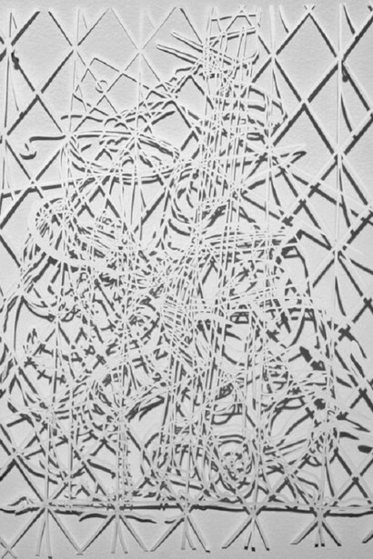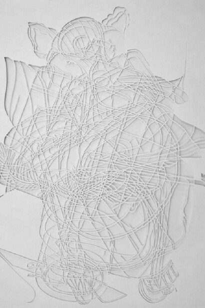 New York artist Sam Stabler presents his works on paper for the first time at 60SIX. He creates his cut-outs by beginning with detailed drawings based on "old master" paintings interspersed with references from modern culture (film, advertising, almost anything you can think of); he then masterfully cuts out elaborate shapes and lines from the drawings, in the end flipping the piece over to show the reverse side...an abstract web of texture and shadow. Unrelated yet interconnected pictures made of empty space draw the viewer deeply into a sort of visual puzzle. The works are ultimately concerned with line, movement and surface tension. Whether there is any meaning in the hidden icons might be the point.
