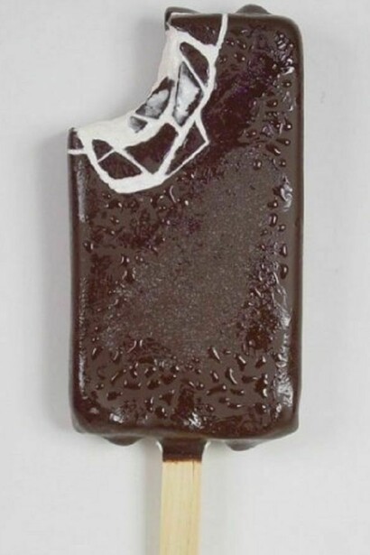 Peter Anton possesses the talent plus the necessary wit to work on this scale. He is also a superb artisan. (If he were a painter instead of a sculptor his skillfulness would ally him with Photo Realism) Although we’re fooled into thinking anything in Anton’s plaster inventory is real, the way his confections brush against reality causes a frisson. Anton’s objects are startling realistic down to the last detail: the sugar crystals that coat outsized gum drops seem so right that if we haven’t yet surrendered to Anton’s vision, a spell of anxiety might precede the enchantment.