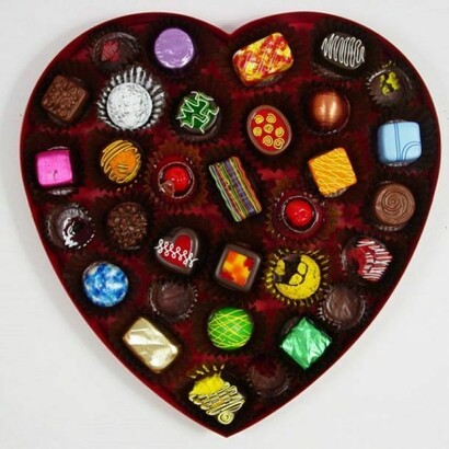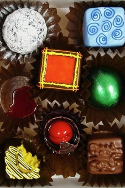 But Anton’s chocolate boxes are his richest and most sustained work. The very notion of a heterogeneous sampler box gives him license to play within the confines of the grid box. The chocolates veer into decadence. They embody an inherently dark vision, and in some pieces Anton exploits this by making pieces that look ravaged as if they had been bitten into and abandoned in their comprised condition. Some of the grid box contains squares that jar the viewer because they are empty, save for the pleated paper.
