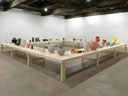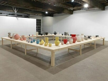 For her second exhibition at Anton Kern Gallery, Los Angles based ceramic artist Shio Kusaka will present 127 porcelain and stoneware pots. Kusaka models ceramic vessels of which no two are the same. Their shapes are simple and usually bottom-heavy or columnar. A choice of palette is enlivened with surface textures, patterned markings and colored lines. Though they look utilitarian, this is not why they are made. It is clear that formal considerations are paramount for Kusaka and that there is an exploration through the ceramic medium of these formal concerns. As Roberta Smith stated in her 2011 review in the New York Times “If the Minimalist painter Agnes Martin had been a potter, she might have made vessels like these.”