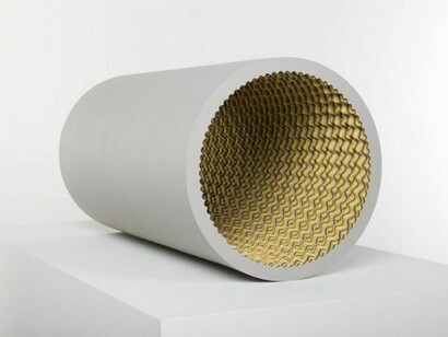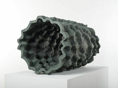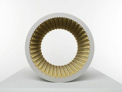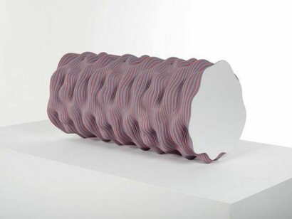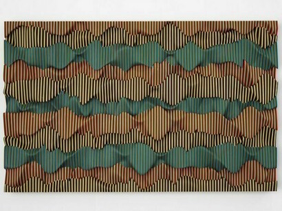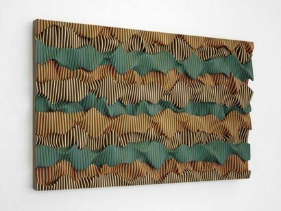 Over the past decade Peterson’s sculptures have used familiar materials, paint and wood, to counterintuitive ends. Peterson drafts patterns based on imagined forms and the kinetic attributes of wave formation. Each sculpture, realized with layers of painted wood, prompts viewers to reconcile the stasis of rigid materials with the dynamism of undulating visual bands. While the patterns suggest motion and malleability, the unique incongruities of hand-painted, organic materials reveal the significant labor underpinning the illusion of each surface.