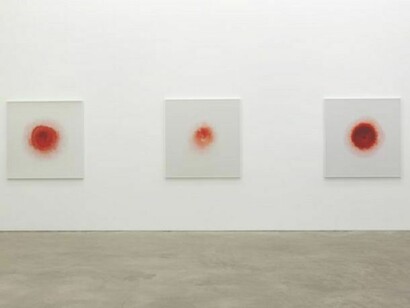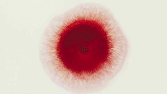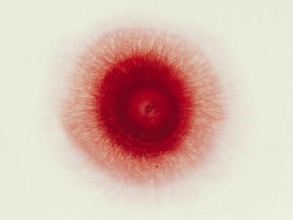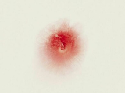 The Love Me Love Me Not photographs actively resist identification. They are highly abstract, appearing alternatively as miniature flowers or as mandalas, metaphysical or symbolic representations of the cosmos. Using a high definition camera, Gersht captures a drop of blood as it disperses through milk. Initially, the blood appears as a black puncture hole, growing symmetrically and gradually outwards. It becomes a deep red as it pushes away from its inception, transforming into a pale pink before the two fluids coalesce into a single entity. The purity of the milk is at odds with the blood, an aggressive contaminant. In three separate places, the Torah says that the devout may not “boil a kid in its mother’s milk,” which is the basis for the requirement that meat and dairy cannot be eaten together.