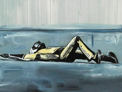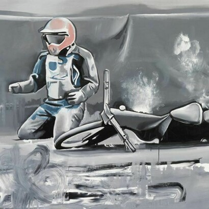 As a child, Sasnal frequently visited the racetrack in his hometown of Tarnow. Memories from these trips serve as the subject matter for his new paintings. The works show anonymous motorcyclists lying on the ground after a wreck, or struggling to get back on their feet.