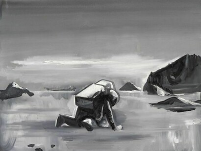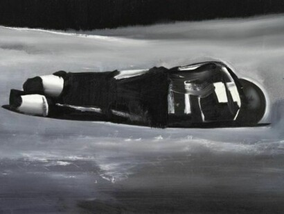 In his new paintings, Sasnal explores the sensation of losing control through two seemingly disparate subjects: wounded motorcyclists lying on a racetrack after a wreck, and outer space. Using a muted palette of gray, blue and black, he presents the moment when space becomes apparent, both in the physical sense of falling to the ground, as in the paintings of the motorcyclists, and in the more abstract sense of the great emptiness of the universe, as in his paintings of solar systems and space.