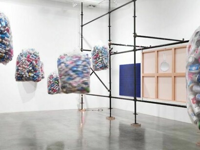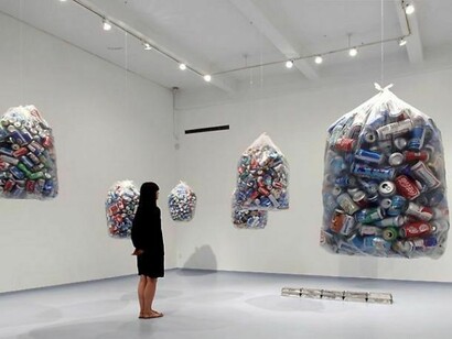 One of the bags turns around itself and acts as a kinetic sculpture evoking the endless cycle of recycling. The artist suspends for a moment the continuous process of exploitation of the cans (used, abandoned, melted and re-used virtually forever) creating a form of redemption for them that, from the condition of value-less and meaningless objects, become artworks mimicking the possible salvation of people continuously evicted from the productive cycle and deprived of a destiny by poverty.