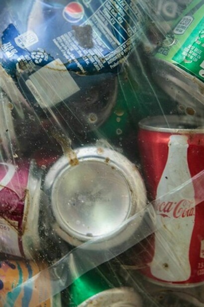 On the wall a ten dollar note folded on itself makes appear the word "Tears" as if it was hidden in the very fabric of the dollar bill as an encrypted message. The recycled cans, inside the bags suspended in space, redeemed from their status of trash, deploy an unexpected beauty and a powerful presence. Their hollowness draws as a watermark the trajectories of the disappeared liquids inside multitudes of unknown bodies and the comings and goings of vagrants, homeless and unemployed people that collected these empty shells.