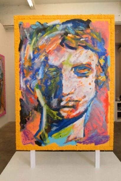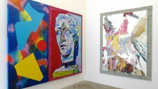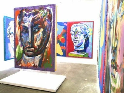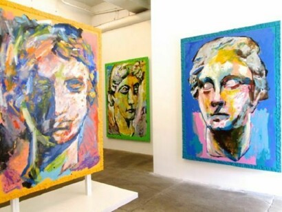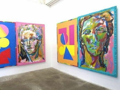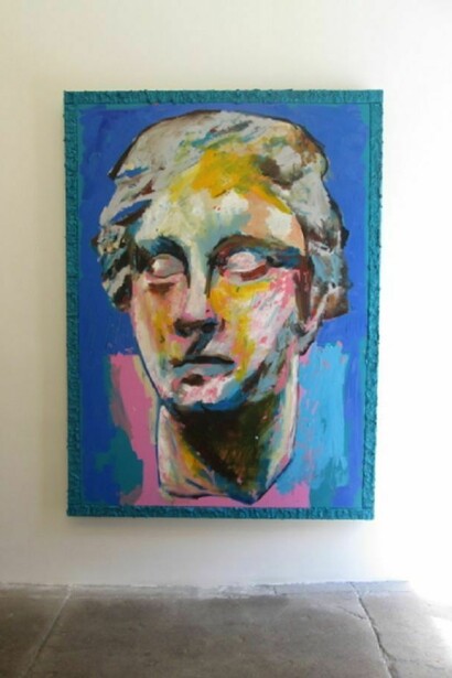 In Cardboard Lamb Justin Samson presents a series of large paintings. Drawing from the psychological charge of the face, Samson depicts ancient Greco-Roman sculpted heads. These heads are broken, worn away, and severed. They are depictions of faces lacking in descriptive features such as skin tone, eye color and movement. Samson captures the cold white of the sculpted marble heads against the vibrancy of his electric backgrounds. A sexy blank stare from a severed head is emotionless floating in beautiful landscape. Juxtaposed to this is a collection of abstract paintings, which continue to reflect the art object’s spiritual presence; somewhere in between a prop and a character to our own reality. A realization of a fantasy.