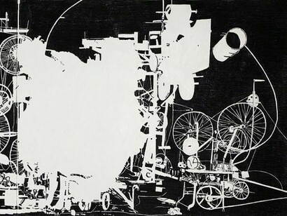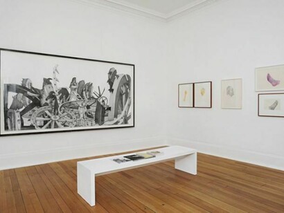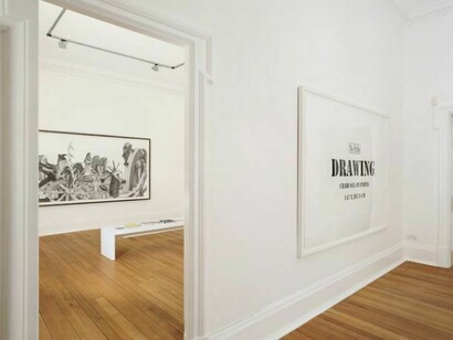 There are only three drawings in existence around his most emblematic project, 'Break Down', 2001, reunited for the first time in the show, whereas his un-realised homage to Jean Tinguely ('H2NY', 2006-07), has given birth to a larger than life opus of hundreds of works on paper, all executed from films and photographs from the Sixties, in such diverse techniques as glue, oil stick, crayon, correction fluid, bleach, wax, ink and charcoal.