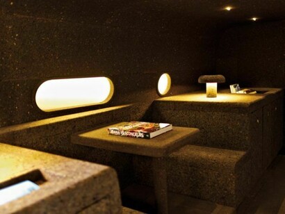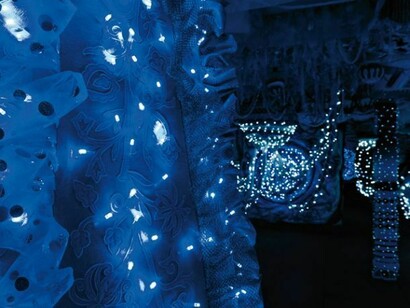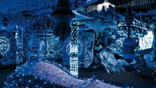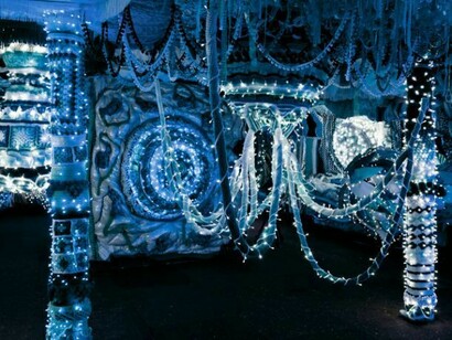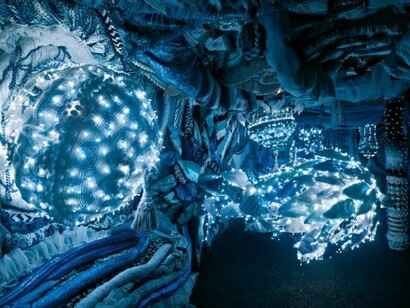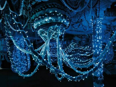 On its deck, she created an environment made of textiles and light—a complex medley of blue-and-white fabrics all over the ceiling and walls, from which crocheted pieces, intertwined with LEDs, emerge to create a womblike, surreal atmosphere. The installation suggests the deep ocean—something out of Jules Verne's Twenty Thousand Leagues Under the Sea, perhaps, or the Bible story of Jonah and the Whale.