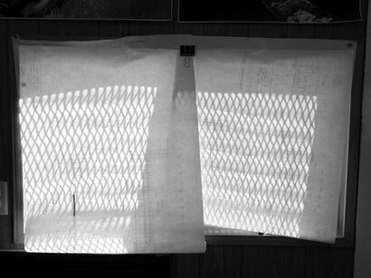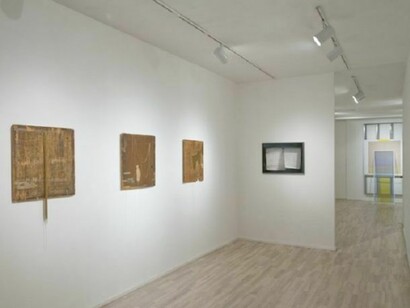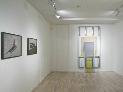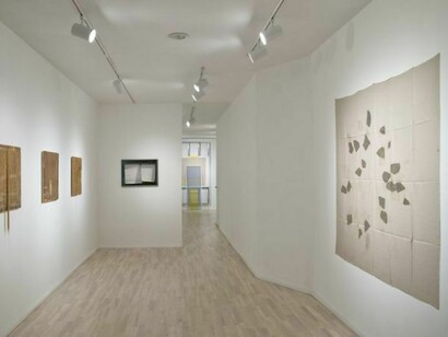 In Barney Kulok’s high-contrast, silver-gelatin photographs of the construction of the Franklin D. Roosevelt Four Freedoms Park on the southern tip of Roosevelt Island, Louis Kahn’s unfinished memorial is recorded through the remnants of building: a hammer and chisel on a granite step, light streaming through a corner piece. Lisa Sigal’s Hinged Painting (Quito, Ecuador) literally filters the viewer’s perception by placing photographs of urban decay behind a spray-painted window screen. The image is printed on Tyvek paper and mounted on drywall, embedding landscape in the world of construction. Marc Swanson even more explicitly engages how nostalgia and melancholy alter our perception with three new pieces made from discarded crates and draped metal chains, their mundane materials a testament to a presence now lost. Finally, Helen Mirra’s oil-and-graphite Field Notations set up the perception of “having-been-there,” when over the course of a day’s walking, Mirra makes seven prints, one each hour, on the linen she carries in her pack. The work is, in the artist’s words, “a kind of paced printmaking, made through walking.” Together, the exhibition addresses relocation as a trace of memory.