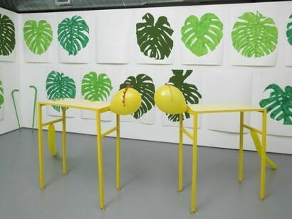 Downstairs, two artists present two different domesticated natures. Sophie Nys’ Parque do Flamengo, portrays the park of the same name built on a landfill in the bay in Rio de Janeiro which was designed by Roberto Burle Marx between 1954 and 1959, and completed in 1965. The park, seven kilometers long, is a film and a song in itself. For the film, Nys invited Arto Lindsay to compose the soundtrack based on the names of the plants used by Burle Marx in the park. Finally Simon Popper’s paintings on paper of Monstera Deliciosas (also known as Swiss Cheese Plants) are inspired by Ellsworth Kelly’s plant drawings, and were made after studies of the plant at the Palmengarten in Frankfurt. Here the taxonomic pictorial studies that are common to Popper’s work become wallpaper decoration. Meanwhile two Lion credenzas in the style of World of Interiors complete the domestic scene while winking to the lions that appear in Henri Rousseau’s jungle paintings, jungles that Rousseau only visited in his imagination and which he constructed from visits to the zoo and the botanical garden.