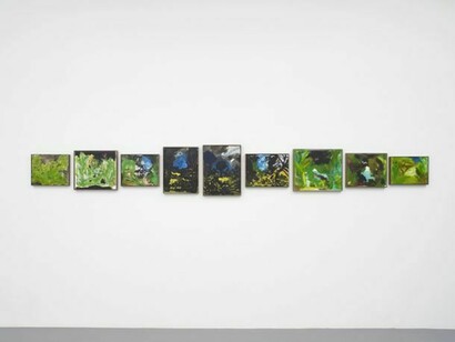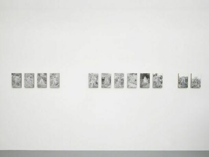 In TopoDendroPhilia the exhibition space is articulated by a series of natural, tectonic and historic layers that the visitor penetrates as an explorer would do in the jungle, and which attempt to rethink the possibilities of ‘savage thought’. Jean-Pascal Flavien’s Dinosaur Drawings are set in tropical or antediluvian landscapes, in them prehistoric time co-exists with science fiction producing a collapse of time. Daniel Steegmann’s red aluminum chain curtain becomes a grotto entrance that marks the transition towards a vegetable environment. Here, Adrien Missika’s photographs of plants and gardens in Brazil designed by Burle Marx are shown on display structures inspired by the ones used in the botanical department of the Indian Museum in Calcutta. Steegmann’s hologram shows a gardening hand covered by grown leaves, blurring the border between animal and vegetal. Julia Rometti and Victor Costales’s Americanas are a series of portraits of dead agave plants, a succulent that only flowers once in its life after which it dies. Meanwhile their film, Plantas Populares Movimiento: Agitato is a portrait of ‘house plants’ agitated by wind and filmed in their natural habitat, the Amazonian jungle. Leonor Antunes Random Intersection 3 hangs from the ceiling, in it leather horse bridles are buckled in sensual domination creating irregular configurations; the hanging structure resembles lianas or tropical vines, but also recalls Gego’s (Gertrude Goldschmidt) interweaving Reticuláreas. Alejandra Seeber’s Black Paintings are a series of night paintings of black grass and rainforests, here darkness prevails over the common ‘green’ image associated with these landscapes—nevertheless amongst the density one can see the light. In the same way Stefan Brüggemann’s neon appears like a green light at the end of the exhibition jungle, A cement cube in the jungle explores the relationship between image and text, and the relationship between abstract geometry and the hidden nature of the world.