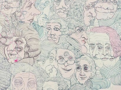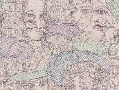 In Parterre, named after the open space near the front of the stage where half the audience stood during a theater production, Lerma takes the figures from Martini’s print and compresses them to create his own “audience” within the work. Made with a fine-point airbrush technique that resembles a ballpoint pen, the monumentally scaled canvas rests on two electric keyboards, which produces a droning soundtrack. This, in turn, forms a tongue-in-cheek reference to the metaphoric weight of painting’s history on contemporary artists.
