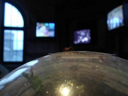 Kuai Shen (Guayaquil, 1978. Lives and works in Cologne). He graduated in Digital Arts at the University of San Francisco de Quito and he got a Masters Degree in Multimedia Arts from the Academy of Media Arts in Cologne. He took part, among other festivals and biennials, also at Manifesta 09 in Genk (2012). He wrote a book about his research "Biologically-Inspired Computing for the Arts" published by the University of Colorado. His work explores the relationship between technology and human sociality of ants. The two turntables in his installation, respond to the motion within a colony of ants, their sounds are recorded with a needle on a vinyl record.