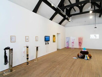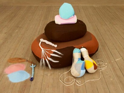 The hand appliquéd felt forms and glazed ceramics within Jonathan Baldock’s new sculptural installation (2013) are made considering the body and have the potential to be used for performance, or to be activated in a ritualistic manner. Although the ceramic tools allude to function, they are absurd in their material qualities and are too delicate for use. Baldock plays with concepts of functionality through ornamentation, creating a tension between the theatrical and playful, erotic and disturbing. Using bright colours with earthy browns the work also deals with the formal considerations of painting and sculpture rooted in art history. Arranged considering composition, colour and form, the work is informed by British modernist master artists such as Hepworth and Moore.