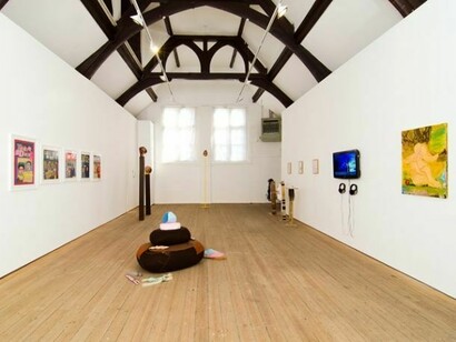 Grant Foster’s recent body of work included in the exhibition explores the reformative and transformative effects of punishment. Crudely formed heads have been collaged together, to suggest a collection of trophies that satiate a lust for revenge. Your Debt To Us, 2012, employs a tabloid vernacular to address the ethics of representation and the erosion of innocence. Drawing from folk and outsider art Foster gives voice to the marginal, whilst addressing the baying mob. Virtue and innocence is further explored in his heavily worked paintings; The Fall, 2013, depicts a young Eve in a lurid Eden where childhood innocence has been lost to a world abandoned by God. The performative physicality of the paint stresses the painting’s objecthood, rather than the illusory. These paintings teeter on the edge of collapse having been over-worked, and over-loved they become almost suffocating, which in relation to the image (related to or featuring children) sets up an uncomfortable proposition.