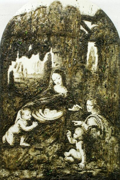 The works by Enzo Fiore narrate the union of mankind – nature becomes determinant and inescapable. Since his debut in 1997, nature has been the protagonist of his work, the element which the artist utilizes to create his paintings. The organic matter – musk, branches, leaves, roots, soil, stones – become the instruments with which Fiore operates; since 2008 he has also made use of insects in some of his works. The latest artistic production differs from earlier works in the strong and impetuous background colors that visibly lighten the atmosphere of the canvases and exorcise the theme of death and decomposition. The relationship between Eros and Thanatos finds a constant dialogue in which beginning and end, genesis and apocalypse, creation and annihilation all interact in a continuous and intense exchange. The inanimate matter takes on new forms and becomes an expression of flesh, body and life.