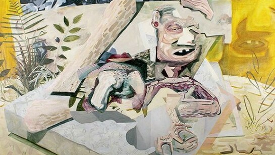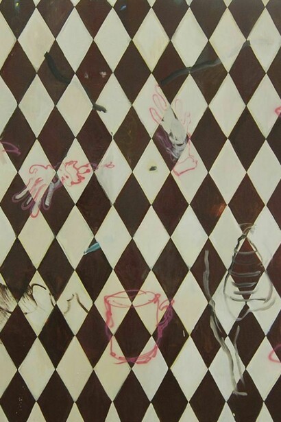 The works that enunciate the least of the three, Benjamin Brett, takes an almost playful approach to the concept of space, where context prevails and Brett exhibits a cognizance for the construction of the ‘background’; yet we are scarce to see any regimented approaches here, apart from the occasional rhombus-motif foundation lain beneath which his painterly gesture takes shape. The contextual emerging gestures and references are buoyant, suggestive, barely figurative, yet the mind connects these painterly marks into a kind of mental connect-the-dots, where narratives emerge. But it cannot be precisely said whether Brett’s intentions are to have the viewer construct narrative, or we are simply hard-wired to consider symbols in this semiological manner. In any regard, Brett has created a subtle tapestry for our consideration, wherein confident but marginally-obscure colour choices and sublimated; nearly cartoonish figurative articulations trace the stream-of-consciousness markings of the maker; and palimpsestial colours beneath layers of thin paint suggest paintings beneath paintings - a process of definition and re-definition: marking and mapping the abstract.