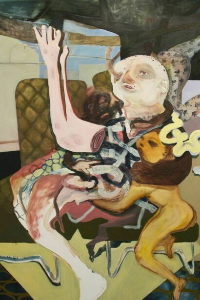 While the beings in Daniels’ works come across as the most overtly humanoid, his paintings are concerned with what is happening on a much more complex scale: here he acts as the narrator of his own surroundings and diegesis. His paintings depict bodies and spaces that are altered, dislocated, and fragmented through the internalization of the socially built spaces that he has himself created. But is narrative of any importance here at all? Certainly linear narrative takes a secondary role to the complex relationship that occurs between the role of paint upon a support. The paintings become imbued by their textural quality, their daring and off-kilter compositions, the abundance of oblong shapes that might suggest limbs, tongues, plants, animals, or viscera, or conversely, that may exist within the confines of the painting just because. A combative shift of the body’s relation to space used to create identities non-contingent on linear narratives.