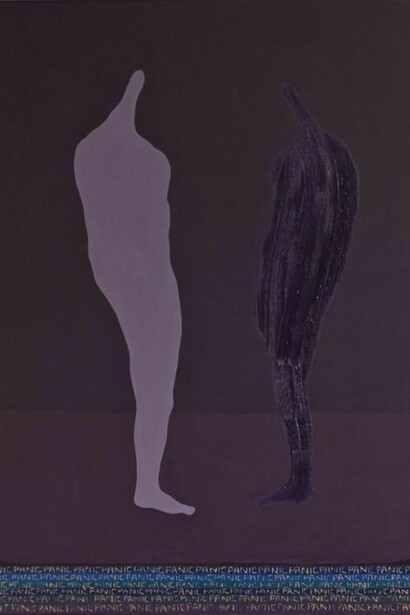 Similarly, Myriam Blundell writes that Robert Fry’s “enduring preoccupation is to find a visual equivalent to the metaphysical space separating the act of representation from the language of abstraction”. While the suggestion of the figure is central to Fry’s practice, it is the relationship between the being, the surrounding, and the paint itself wherein which Fry finds his locus. The atypical color-choices and painterly immediacy further affirm Fry’s statement, the (ungendered, but historically linked to royalty and piety) deep purple at use here becomes almost Fry’s trademark hue upon which shadows, anatomical extensions, and dismembered body parts refer to a deepening of psychological states, not unlike Rorschach inkblots. But something about his color choices becomes carnal - we see references to Bacon, Guston, Twombly, (and, in Man with Vesalius Skeleton, even Dutch anatomist Andreas Vesalius) but the languages and landscapes emerge as undoubtedly Fry’s own creation.