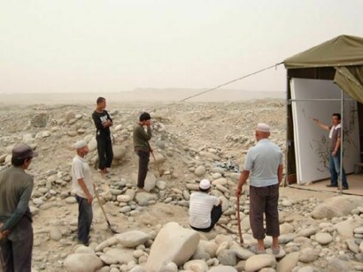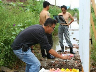 For his most recent major body of work, The Hotan Project (2012-13), exhibited at the Today Art Museum in Beijing earlier this year, Liu produced a quartet of monumental canvases and numerous over-painted photographs in and around the notorious opencast jade mines and the devastated landscapes of a remote area of China’s largest, westerly province of Xinjiang, close to Tajikistan, Pakistan and Afghanistan. His Hotan pictures capture a group of workers digging for increasingly rare jade deposits and highlight the ethnic and social tensions between the predominantly Muslim locals, the Uygur, and the ruling Han Chinese to whom the precious stones are generally sold to, either as carved objects or as an alternate form of currency. In the past, the artist has chronicled the realities of modern China, in depictions of villages destroyed in the construction of the Three Gorges Dam for Three Gorges: Displaced Population (2003-06), while Out of Beichuan, Into Taihu (2010) was painted amid the rubble of the Sichuan earthquake.