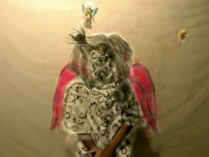 At the heart of the exhibition are two works presenting the universally recognised characters of the angel and the devil. In Distorted Reality Performance # 43 (2006), a veiled angel defies categorization; its smudged and feathered wings introduce a painterly quality to the picture plane that references Samra’s early relationship with painting. Here though they are rendered