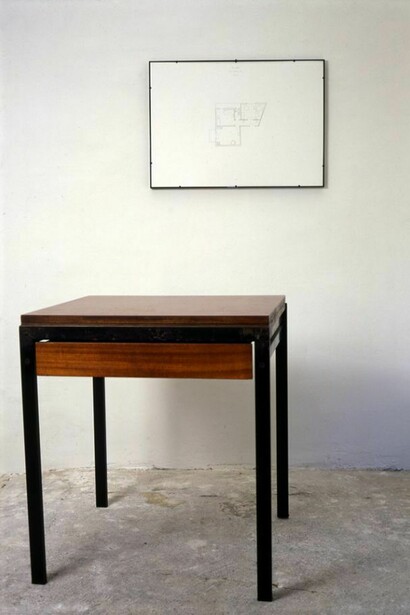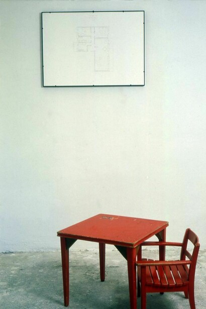 Among others a small red table and its little chair with the map of the flat in Genoa “Via delle Ginestre 24/14”: it’s a children’s piece of furniture located originally in the apartment where the artist lived as a child and which moved on with him from childhood bearing always different uses. “Industrial objects stand as candidates to universality creating a lingua franca” (F. La Cecla: Non è cosa. Vita affettiva degli oggetti - non siamo mai soli. “ Elèuthera, Milano 1998, p. 39). Vitone’s work intends to rescue them from neutrality. Therefore objects are no more impersonal, since they are charged with a surplus of meaning: mere objects, originally defined by their useand exchange value become fetishes, “as they will be charged with a social or intimate relation that does not originally compete them” (F. La Cecla, op. cit.p. 45) They slide from pure material evidence to an invisible investigation carried out by the subject. The maps are a bridge between private and collective sphere, objects and maps interfere in order to give the spectator a password to the artist memories. The table is no more a table, it becomes that table: in the age of reproducibility the aura will be found in uniqueness. Objects talk , they tell us stories, they are no more what they looked at first. Even spaces are the result of a much deeper complexity. “we have to learn again how to consider the space” , affirms Marc Augé in Nonluoghi. Introduzione a una antropologia della supermodernità, Elèuthera , Milano 1993,p. 37)