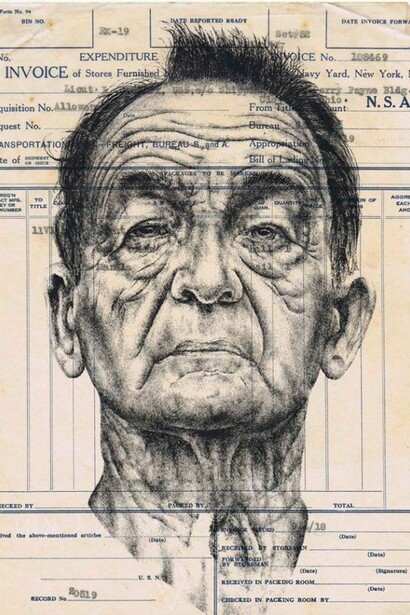 Hang-Up Gallery is delighted to introduce Drawing on History, the enigmatic exhibition from talented London based artist Mark Powell. Using nothing but a simple Biro pen, Powell creates incredibly detailed portraits of the elderly. His chosen canvases are antique documents dating from 1763 onwards. His aim is to portray what can be produced with the most basic tool whilst creating a relationship between the canvas and image.
