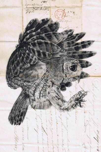Powell collects numerous documents on his travels, from love letters sent during the First World War to Parisian newspapers. He then delicately draws on the faces of the elderly from his visual diary of sketchbooks and photographs. Each piece conveys a history and a rich sense of journey. Commenting on the outcome for the show at Hang-Up, Powell says, “I want to make people realise what you can do with the simplest things, and leave a real sense of ambiguity".