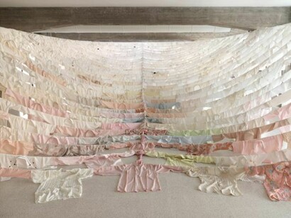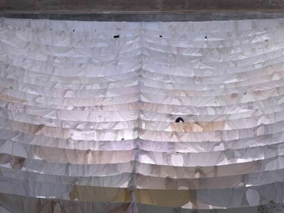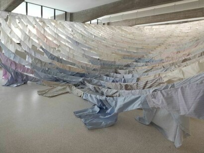 With this work the space is redefined as an inhabited and habitable place recalling the hull of a ship. The simple lines of the hull are divided in two parts that expand from the ceiling to brush the floor with an even semicircular compositional rhythm given by shirts knotted together evoking a dialogue between male and female, past and present.