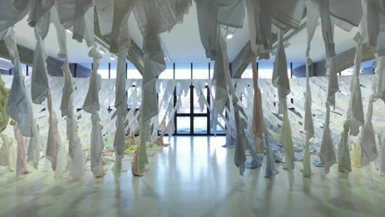 Kaarina Kaikkonen works directly on spaces, interpreting them anew, through the use of everyday objects, such as for example jackets and shirts which are her plastic tools of choice.