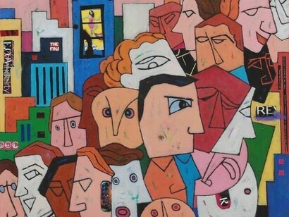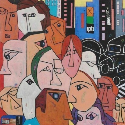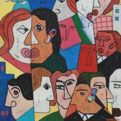 Tokyo artist Kiyoshi Kawaguchi's artistic aims involve giving confidence & encouragement to people "who" in the words of the artist "were tossed by the hard wave of the age". Kiyoshi Kawaguchi's paintings of urban life synthesize with irony and humor the exuberance and rhythms of city life in paintings that are a perfect blend of his native Japan's love of Jazz improvisation and the classical sophistication of early modernist painters of the 30's.