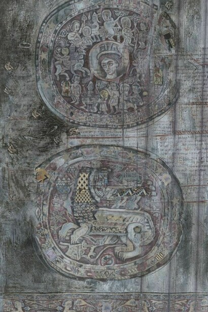 The pieces included in Laces & Surges borrow imagery from Coptic textile patterns. By doing so Taguti has adopted a form that can be edited, supplemented, and ultimately distorted, as the Coptic fabrics have multiple meanings and multiple lives. They are a palimpsest that provide the basis for an infinite series of adaptations and reincarnations, as their borrowed symbols begin to disappear under the additions and modifications of Taguti. Half erased and partially magnified, Taguti creates a new meaning and a new secret, perhaps sacred, language. Where once there was the face of a saint, we see a benign Lenin or the famous Rodchenko image of Lilya Brik, a thoroughly Soviet siren and muse.