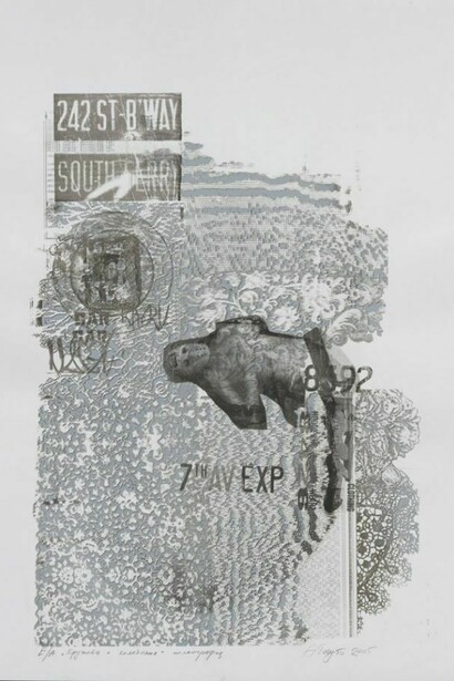 Primarily working with seriography, Taguti has an innovative and open approach to printmaking. Her process is fluid and fleeting, again allowing for multiple interpretations. The processes she uses leave material traces of making, traces that in themselves become part of the narrative of the image. Frequently collaging her prints into larger panels, the images defy a simplistic, mimetic reading of the imagery. Her choice of printmaking alone is central to the reading of the work, for printing is a process of multiples, editions of the same image created over and over, but Taguti’s prints are all one offs, they are all hand-‐finished and all unique. Printmaking in its essence is an image of a memory: the image exists on the plate, or stone, or screen, and what is presented to viewer is an imprint of that image, its afterlife. Though she addresses themes of destruction, her interest lies in the rebirth that will follow.