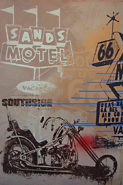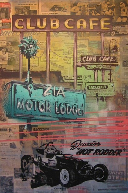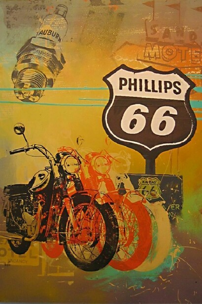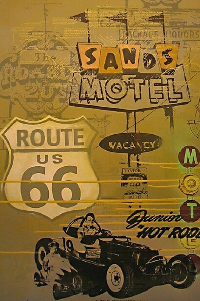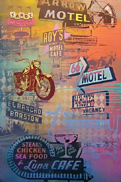 Following a massive sold-out exhibition at C.A.V.E. Gallery last November, Restitution Press returns to the gallery with another ambitious body of work - this time, celebrating the historic Route 66. Borrowing from, and riffing on the signage and cultural iconography of the "Main Street of America", Restitution Press has created an impressive series of mixed media works with imagery that celebrates the dreams and aspirations of generations.