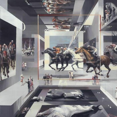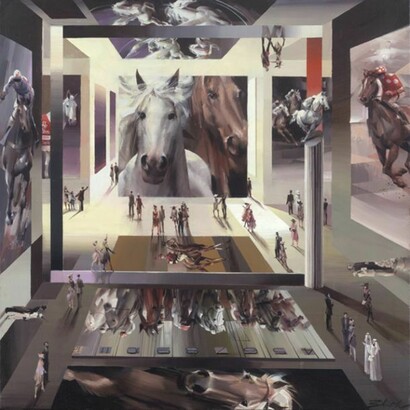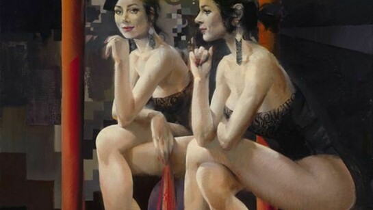 His subject matter ranges from sport, ballet and the stage, to architecture, eroticism and portraiture and selections from this work will be on show at this UK show including the painting, “Bolshoi White Knights” and the drawing “High Density”, both illustrated here.