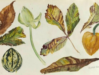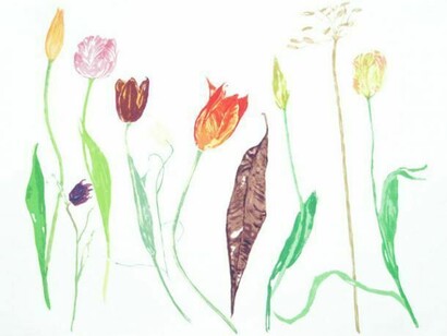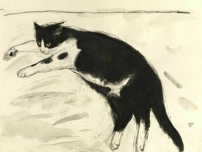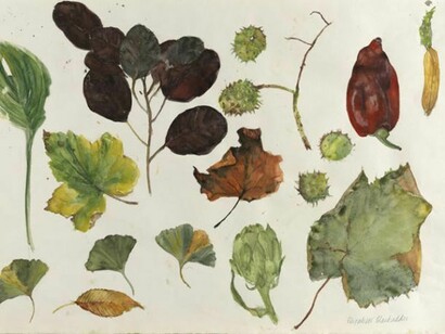 Instead she works away, quietly unconscious of anything except the gentle challenge of the next painting. Each is a subtle resolution suggested by the juxtaposition of stems and blooms; or autumn leaves, the firstbrought as a trophy proffered by Toby, the more tractable of her two cats, arranged in perfect conversation across her sheet.