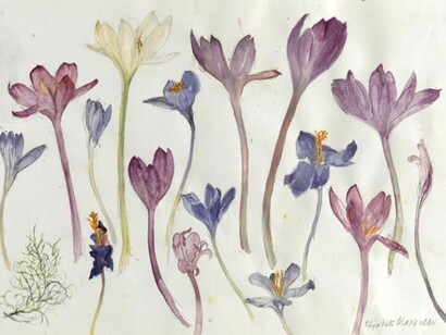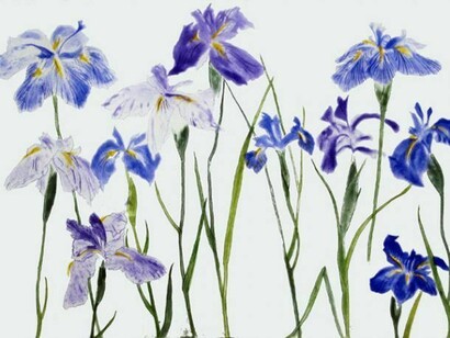 Her familiar irises and tulips are here and then a surprise; roses, ontheir narrow, thorny stems, in dusty pinks, as if picked from a wildhedgerow. From Eddy’s Fish Market or the van that toots its hornin her leafy street come lobsters and mackerel, bought for the table but bounty first for the studio. Two years after her monumental retrospective with the Galley of Modern Art this modest assemblyof new watercolours reminds us that her greatness is undimmed.