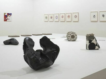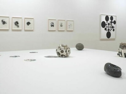 The exhibition started with a fairly simple yet nonetheless unusual exercise: to take one work and see how far it is possible to think with it rather than about it. The work is the 2005 painting The Eye of Go, and thinking with it involves looking right back to the 1990s and an extraordinary sequence of paintings on acetate that are only now being exhibited for the first time, and forward to paintings and a series of river stone sculptures that Orozco has started making since the conversation around this exhibition began.