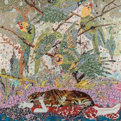 The distance that inevitably separates us, the spectators, from these works —gently but painfully setting us apart from its gardens— recreates an age-old topic in Western art: the expulsion from paradise. In that distance is where these canvases concentrate all their power. By examining them as a world to-be-left-behind —or a world that is yet to come— we cannot but see them as depictions of a religion whose symbols we used to recognize but have now forgotten and are in the process of remembering again. That is why the first sensation we feel in front of these symbols —huge birds, cat-like tigers, embroidered angels, all of them an uncanny system of belief —is counterintuitive: it is an entrancing nostalgia for the future, a retrospective Utopia.