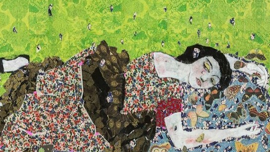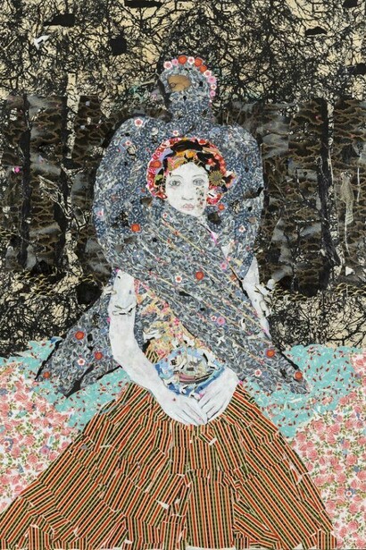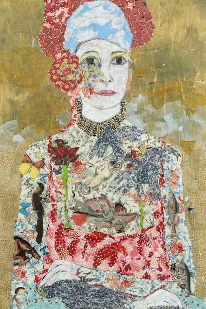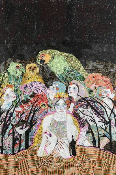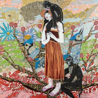 Her careful and laborious assemblage of torn pieces of paper is a way of creating a transcendental space/time where myths and dreams can be told; among them, the story of the all too human yearning to recover the treasures of the lost garden of childhood, which echoes the longing for Paradise Lost. Her new works, which are not exactly collages, can be thought of as producing symbolic surfaces that interweave fabrics and patterns and artistic references (Gauguin, Klimt, Schiele, Frida Kahlo, Matisse, Leonora Carrington, Henri Rousseau, William Morris’ wallpapers) that both reveal and conceal the materials from which they are made of. It is as if she wanted to restore whatever dignity and beauty art may concede to a torn piece of paper and to the imaginative possibilities of it being patiently woven into a story, an image, a dream. Berrio, the constant gardener, is also the patient seamstress. Her works display a secret alchemy that she discovers through the entwinement of the torn pieces: monkeys out of flowers and flowers out of birds, dresses out of leaves, and leaves out of dresses, monkeys out of night skies and nights skies out of monkey fur. If gardens draw attention to the particularities of their details, Berrio has created another garden, a transcendental space, in which materials, colors, textures, and bodies are connected in an ongoing flow that even alters the perspective: butterflies seem to make clothing as much as pieces of cloth cover the sky or the greenery of nature.