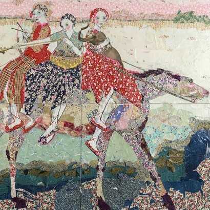 In this way torn flowers, butterflies, strawberries, fishes, angels, and all sorts of Japanese paper patterns, are delicately and fragilely contained within the contours of shapes of female figures and animals. These shapes seem to both hold together and be ripped by the pieces from which they are made of. Just like in dreams, the container becomes the contained, and the contained becomes the container, a blurring of limits that creates a sense of limitedness within the enclosed domain of the dream/work/garden.