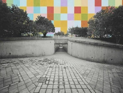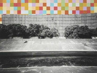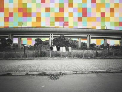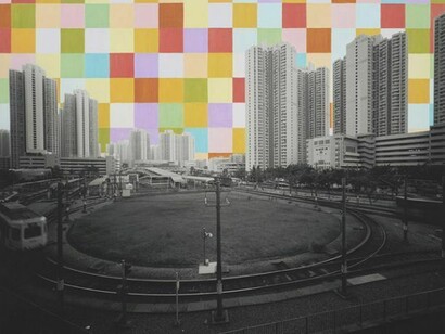 Ho has lived in Tin Shui Wai since his father's passing. In the past few years, he has captured the changing facets of Tin Shui Wai through his lens, as he seeks to turn the photographic act into an imaginary journey with his father in his place of dwelling. The process of painting blocks resembles endless memorials. Ho's previous works such as Into Light and Impermanence set out to illuminate the transience of living. In a similar vein of random existence, the artist picks the color of each block by throwing a dice. He goes on to paint the repetitive, uniformly sized blocks on the photographs using the paintbrushes left by his late father.