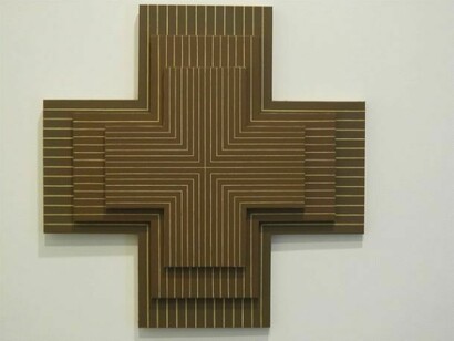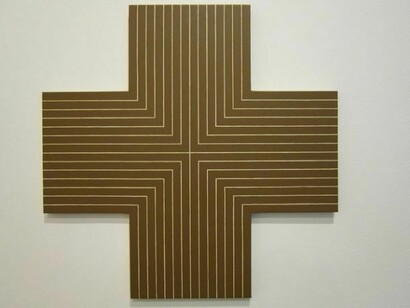 In the present exhibition, a group of paintings based on Frank Stella’s work were inspired by shows of early Stella works that Mr. Pettibone had seen in recent years in galleries in New York City. An interesting work in this group is Frank Stella, ‘Ouray’, 1961, Three Times, 2011, in which Mr. Pettibone made three paintings, each in a smaller size, appropriating Stellas’s Ouray and then layering one atop another, creating a three--‐dimensional relief that reminds us of Jasper Johns’ iconic Three Flags.
