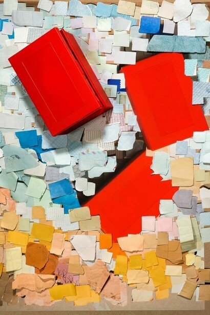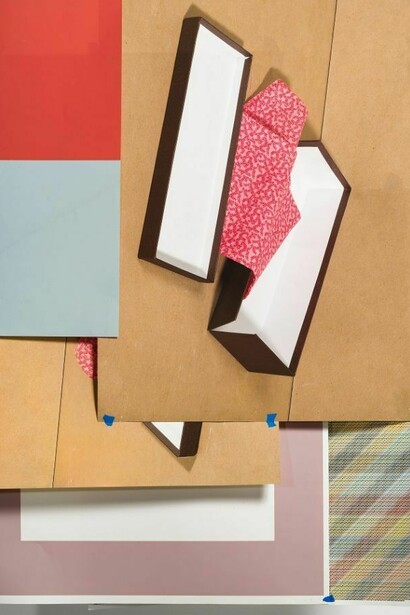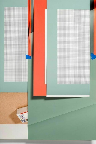 The exhibition expands upon Houck’s body of aggregate photographs, presenting still life imagery of personal objects and keepsakes intermittently spliced with Houck’s ongoing body of digitally-rendered, gridded and folded compositions. As in the aggregates, whereby Houck exploited a repetitious process influenced by his professional experience as a programmer — a feedback loop of write, compile, execute — here he applies a recursive practice of compose, photograph, print.